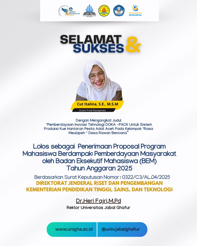 Selain itu, satu dosen UNIGHA, Cut Italina, S.E., M.S.M. yang merupakan Dosen Prodi Manajemen, juga meraih pendanaan Program Mahasiswa Berdampak: Pemberdayaan Masyarakat oleh Badan Eksekutif Mahasiswa (BEM) Tahun Anggaran 2025 berdasarkan SK Nomor: 0322/C3/AL/04/2025. Pengabdian yang lolos berjudul “Pemberdayaan Inovasi Teknologi DOKA-PACK untuk Sistem Produksi Kue Hantaran Pesta Adat Aceh pada Kelompok ‘Rasa Meulapeh’ Desa Rawan Bencana”.